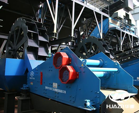 開采后的河卵石原料進入JC顎式破碎機,經(jīng)顎式破碎機粗碎后的石料分為兩部分,粒度小的石料直接由YKR圓振動篩篩分,篩分后進入XL螺旋砂石洗砂機進行洗砂,然后洗干凈的石料再由ZKR振動篩篩分,然后進入洗砂回收裝置;經(jīng)JC顎式破碎機粗碎后粒徑較大的石料進入HPY圓錐破碎機中碎,中碎后的石料進入PLS立式?jīng)_擊破碎機(制砂機)進行制砂整形,然后由YKR圓振動篩篩分,篩分后進入DXS斗輪洗砂機進行洗砂,然后洗干凈的石料再由ZKR振動篩篩分,然后進入洗砂回收裝置。為了保證0污水排放,洗砂回收裝置后有污水處理池,再由板框式壓濾機處理,可實現(xiàn)100%回收循環(huán)使用。