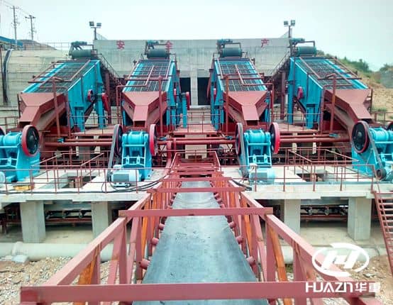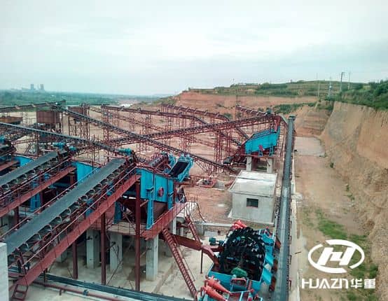 該系統(tǒng)位于陜西境內(nèi),系統(tǒng)以生產(chǎn)建筑用砂石骨料為主,系統(tǒng)設(shè)計(jì)規(guī)模為1200t/h。該系統(tǒng)由我公司實(shí)施工藝流程設(shè)計(jì),主要設(shè)備制造,基礎(chǔ)施工設(shè)計(jì),系統(tǒng)指導(dǎo)安裝,調(diào)試培訓(xùn),交付運(yùn)行。破碎物料為開挖天然礫石料,且泥土含量較高,為了提高成品粒度的品質(zhì)、潔凈程度,該系統(tǒng)設(shè)計(jì)時(shí),著重考慮了系統(tǒng)的篩分、水洗、脫泥工藝,設(shè)備配置為2YKRH2460重型篩4臺,ASD3625顎式破碎機(jī)4臺,HPY300圓錐破碎機(jī)4臺、3YKRH2473重型篩4臺,2XL1118洗石機(jī)2臺,DXS3.6斗輪洗砂機(jī)4臺,SH800細(xì)砂回收4臺等。