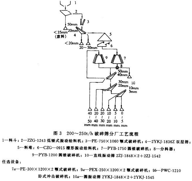 土石質(zhì)原料加工。破碎石料的目的是為工業(yè)制備各種不同粒度要求的碎石。按不同使用目的,根據(jù)產(chǎn)量及最終粒度組成要求,由料斗、給料機(jī)、破碎機(jī)、篩分機(jī)和轉(zhuǎn)運(yùn)、堆集物料用的各種皮帶運(yùn)輸機(jī)組成不同的破碎工藝流程。圖2、圖3列舉了生產(chǎn)能力為30一55t/h和200一250t/h采石場(chǎng)的破碎篩分的典型工藝流程。