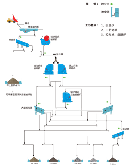 對于礦山廢石二氧化硅含量低于10%的原料加工,可采用強(qiáng)力反擊破為主的生產(chǎn)線加工水泥礦山廢石(見下 工藝圖),該工藝具有投資少、工藝簡單,產(chǎn)品粒形、級配好等特點(diǎn)。
