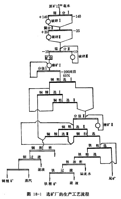 從礦山開(kāi)采出來(lái)的原礦的品位一般都比較低,例如很多鐵礦石合鐵只有20—30%,銅礦石含鋼只有0.5一1%,這樣的礦石直接進(jìn)行冶煉不但技術(shù)上有困難,經(jīng)濟(jì)上也不合算。礦石中又往往含有復(fù)雜的成分,多種有用成分(如期、鉛、鋅、或銅、鋅、鋼、鐵等)可能相互共生在一起;同時(shí)還會(huì)含有有害雜質(zhì)(例如鐵礦石小的硫、磷等)。為了充分合理有效地利用國(guó)家礦產(chǎn)資源,提高冶煉效率,降低成本,必須將礦石中的有用礦物和脈石相互分離,提高有用礦物的品位;并把共生的有用礦物盡可能地相互分離成單獨(dú)的精礦,除去各種有害雜質(zhì)。我們把有用礦物的宮集過(guò)程稱(chēng)為選礦。圖18—1是某選礦廠(chǎng)的生產(chǎn)工藝流程。