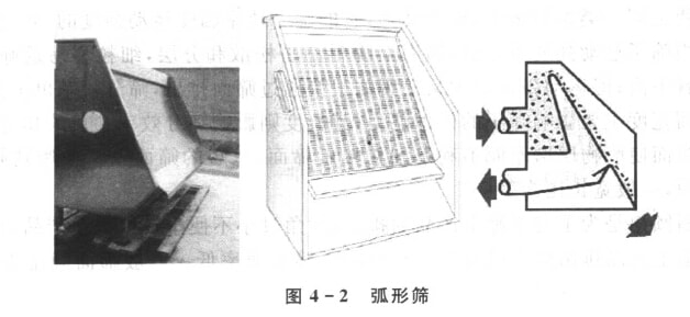 弧形篩(圖4—2)篩面呈弧形,待篩分物料制成料漿。料漿含水約為30%。 從弧形篩頂部結(jié)入。在篩面上,由于料漿受重力、離心力及篩條對(duì)料漿的阻力作 用,使料漿緊貼篩面流動(dòng)。緊貼篩面的下層料漿運(yùn)動(dòng)速度低,細(xì)粒和液體從篩縫 中落入篩下,大顆粒從篩面末端排出。一般通過篩縫的顆粒尺寸為篩縫寬度的 1/4,所以這種篩不易發(fā)生堵塞,但篩分效率低。