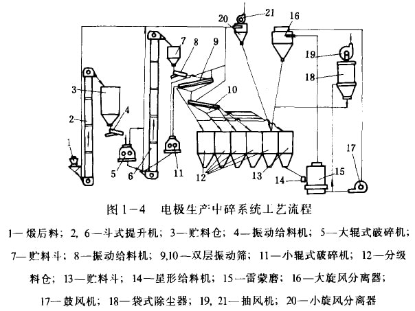 圖1—4為電極生產(chǎn)中碎系統(tǒng)綜合工藝流秤。由圖可見,鍛后料1由提升機(jī)2提升到儲(chǔ)料倉3,再由電磁振動(dòng)給料機(jī)4加到輥式破碎機(jī)5,破碎后的料由提升機(jī)6提升到儲(chǔ)料斗7,再由電磁振動(dòng)給料機(jī)8加到振動(dòng)篩9,大于4mm的料進(jìn)入小對(duì)輥破碎機(jī)11繼續(xù)破碎,然后進(jìn)人提升機(jī)6。從振動(dòng)篩9篩出的4—2mm的料進(jìn)入料倉12(進(jìn)到4—2mm分級(jí)科倉)。小于2mm的料進(jìn)入振動(dòng)篩10,篩出的2—1mm、1—0.5mm、小于0.5mm的料分別進(jìn)入料倉12的各分級(jí)料倉中。料倉12中的不平衡料進(jìn)入貯料斗13,再經(jīng)溜槽和星形給料機(jī)14加到雷蒙磨15進(jìn)行磨粉。磨細(xì)的粉由鼓風(fēng)機(jī)17鼓進(jìn)的風(fēng)帶著經(jīng)過雷蒙磨上的分離器進(jìn)入旋風(fēng)分離器16,使粉與空氣分離,分離出來的細(xì)粉下列0075mm分級(jí)料倉中。經(jīng)分離后的空氣再經(jīng)鼓風(fēng)機(jī)吹入雷蒙磨。為了保持磨機(jī)內(nèi)一定的風(fēng)壓,多余的空氣被送到布袋除塵器18,除塵后的空氣由抽風(fēng)機(jī)19排放,粉塵下到0.075mm的分級(jí)料倉。
