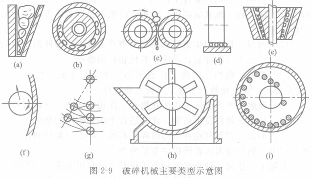 (2)根據(jù)破碎方式、機(jī)械的構(gòu)造特征(動(dòng)作原理)來劃分,將破碎機(jī)械大體分為六類,如圖2—9所示。