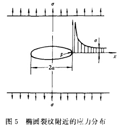 圖5表示一個橢圓裂紋附近的應(yīng)力分布情況。從圖可見,在離孔遠(yuǎn)處,應(yīng)力分布受孔的干擾很小,基本上是均勻分布的。在長軸的兩端點(diǎn)上,有高度應(yīng)力集中,而在短軸兩側(cè),應(yīng)力被卸除,形成低壓區(qū)。當(dāng)橢圓的短軸長度衰減至零時,便是一條長度為2α√σπ的裂紋。當(dāng)ρ≤α時,最大應(yīng)力為: