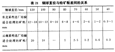 許多選礦廠出于省事,而且對(duì)鋼球尺寸在粗磨礦中所起的作用認(rèn)識(shí)不足,磨機(jī)裝球直接參照一些書中所列出的經(jīng)驗(yàn)球徑(表21所示)。表中的球徑值與表19所列的國(guó)外選礦廠粗磨球徑相比,這些經(jīng)驗(yàn)球徑明顯是偏大的。主要原因在于這些經(jīng)驗(yàn)球徑來(lái)源于五六十年代選廠磨礦實(shí)踐,而當(dāng)時(shí)的磨機(jī)直後均較小,只能以鋼球重量來(lái)彌補(bǔ)勢(shì)能的不足。而現(xiàn)在選廠多采用大直徑磨機(jī),所以直接采用經(jīng)驗(yàn)球徑誤差也是較大的。
