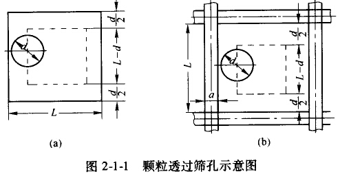 研究單顆礦粒透過篩孔的概率如圖2—1—l所示。假設有一個由無限細的篩絲制成的篩網(wǎng),篩孔為正方形,每邊長度為L。如果一個直徑為d的球形顆粒,在篩分時垂直地向篩孔下落?梢哉J為.顆粒月篩邀不相碰時.它就可以毫無阻礙地透過篩孔。換言之,要使顆粒順利地透過篩孔,在顆粒下落時,其中心應投在紋有虜線的面積(L—d)²內(nèi)(圖2—1—1a)。