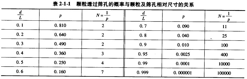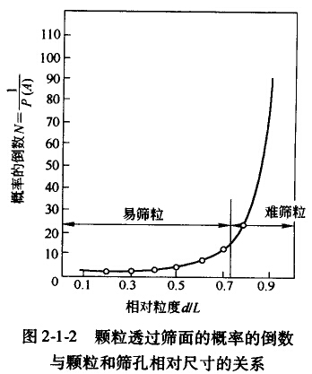 取不同的今比值計算出的P和N值,見表2—1—1。利用這些數(shù)據(jù)可畫出圖2—14的曲線。曲線可大體劃分為兩段,在顆粒直徑d小于0.75L的范圍內(nèi),曲線較平緩,隨著頹粒直徑的增大,顆粒透過篩面所需的篩孔數(shù)目有所增加。當顆粒直徑超過0.75L以后,曲線較陡,顆粒直徑稍有增加,顆粒透過篩面所需的篩孔數(shù)目就需要很多。因此,用概率理論可以證明,在篩分實踐中,把d<0.75L的顆粒稱為“易篩粒”和d>0.75L的顆粒稱為“難篩粒”是有道理的。