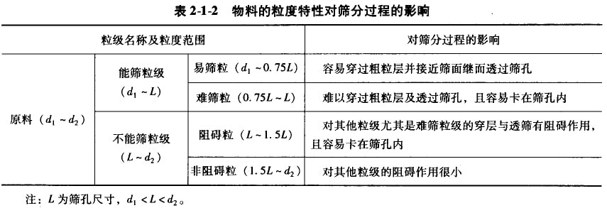 由表2-1-2中可知,原料中所含的難篩粒及阻礙粒相對其他粒級較多時(shí),對篩分過程不利:而所含的易篩粒和非阻礙粒相對其他粒級較多時(shí),對篩分過程有利。