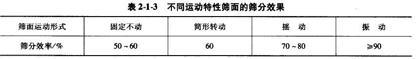 (1)篩面運(yùn)動形式。篩面運(yùn)動形式關(guān)系到篩上物料層的松散度及需要透篩的細(xì)物料相對篩面運(yùn)動的速度、方向、頻率等,因而對分層、透篩過程均合影響。例如,物料在固定篩上的運(yùn)動,全靠物料在其本身重力的作用下滑移流動,篩分效果較差;在振動篩上,物料的運(yùn)動能量主要來自篩面的振動,料層不斷地充分松散,顆粒相對篩面不斷地劇烈沖撞,篩分效果較好:轉(zhuǎn)筒篩運(yùn)動平緩,料層松散度不夠,粗、細(xì)顆粒經(jīng)常混雜,使分層不連續(xù),物料相對篩面的運(yùn)動速度較小,篩孔容易堵塞;搖動篩上的物料主要是沿篩面方向滑動,在篩面法向的速度分量較小,不利于細(xì)粒透篩。幾種典型篩子的篩分效率大致如表2-1-3所示。