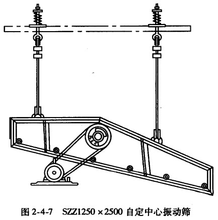 圖2-4-7所示為國(guó)產(chǎn)陽(yáng)SZZ1250×2500自定中心振動(dòng)篩的外形圖。主要由篩箱、振動(dòng)器、彈簧等部分組成。篩箱用鋼板和鋼管焊接而成,篩網(wǎng)用角鋼壓板壓緊在篩箱上。在振動(dòng)器的主軸上,除中間部分制出偏心外在軸的兩端并裝有可調(diào)節(jié)配重的皮帶輪和飛輪。電動(dòng)機(jī)通過(guò)三角皮帶帶動(dòng)振動(dòng)器,振動(dòng)器的偏心效應(yīng)與慣性振動(dòng)篩的情況相同,使整個(gè)篩子產(chǎn)生振動(dòng)。彈簧是支持篩箱用的,同時(shí)也減輕丁篩子在運(yùn)轉(zhuǎn)時(shí)傳給基礎(chǔ)的動(dòng)力。