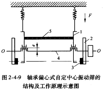 此外,還有一種軸承伯心式自定中心振動(dòng)篩,圖2-4-9是它的示意圖。圖中表明,由于軸承與軸的中心線(xiàn)偏離距離A(約等于振幅),在振動(dòng)中偏心鈾頸雖有向上或向下的位移,但皮帶輪相接文的位置卻是不變的。