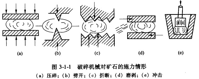 機(jī)械破碎法是靠破碎機(jī)械的施力來完成的,破碎機(jī)械的施力方式不外是壓碎、劈開、折斷、磨剝及沖擊等,如圖3-1-1所示。