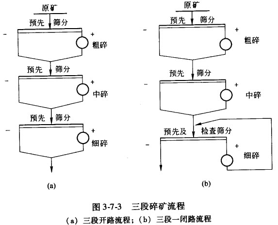 三段碎礦流程的基本形式有:三段開路和三段一閉路兩種,如圖3-7-3所示。