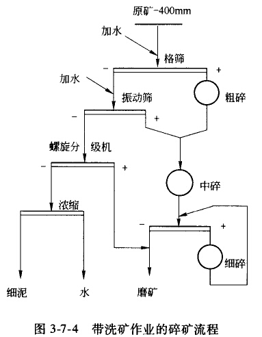由于原礦性質的不同,洗礦的方式和細泥的處理等不同,因而流程多樣,現(xiàn)列舉例。原礦為矽卡巖型銅礦床,含泥6%-11%,含水8%左右,其洗礦流程如圖3-7-4所示,破碎流程為三段一閉路:為使破碎機能安全、正常地生產,第一次洗礦在格篩上進行,篩上產物進行粗碎,篩下產物進入振動篩再洗。第二次洗礦后的篩上產物進入中碎,篩下產物進螺旋分級機分級、脫泥,分級返砂與最終破碎產物合并,分級溢流經濃密機緩沖,脫水后,進行單獨的細泥磨礦、浮選。