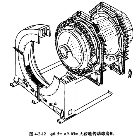 (1)環(huán)形電機(jī)無齒輪傳動球磨機(jī):這種磨機(jī)結(jié)構(gòu)十分簡單,磨機(jī)筒體上固定著電機(jī)的轉(zhuǎn)子,筒體外罩著電機(jī)的轉(zhuǎn)子,結(jié)構(gòu)見圖4-2-12。這種磨機(jī)的轉(zhuǎn)速是通過雙向離心變領(lǐng)器控制電機(jī)供電頻率,使球磨機(jī)轉(zhuǎn)速在一個(gè)小的范圍內(nèi)無級調(diào)節(jié)?筛鶕(jù)礦石可磨性的變化來自動調(diào)節(jié)磨礦機(jī)的產(chǎn)率。該磨機(jī)的處理能力1000t/h,最先在挪威的一個(gè)礦用,目前全世界已有50多臺無齒輪傳動磨機(jī)在生產(chǎn)中應(yīng)用。它減少了一副傳動齒輪,無疑節(jié)省了動力的消耗。