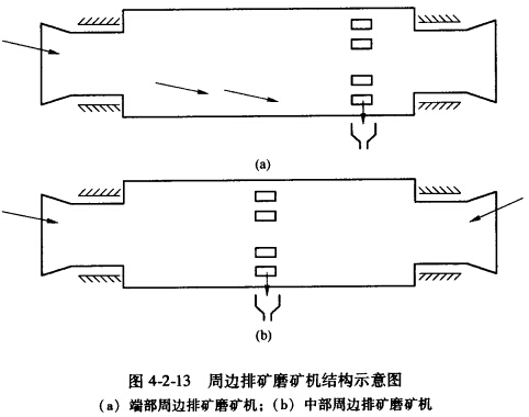(2)周邊排礦磨礦機(jī):一般的磨礦機(jī)是從中空鈾頸內(nèi)排礦,此種磨礦機(jī)的排礦是從筒體周邊上開的排礦孔排出的,由于這樣,它的排礦水平低,排礦速度快,磨機(jī)生產(chǎn)率大,產(chǎn)品過粉碎輕,其結(jié)構(gòu)示意圖見固4-2-13。另一種是中部周邊排礦磨礦機(jī),這種磨機(jī)兩端給礦,中間排礦,磨機(jī)的排礦更快。據(jù)稱,生產(chǎn)宰比同規(guī)格磨機(jī)大25%,過粉碎輕,產(chǎn)品粒廢粗,產(chǎn)品機(jī)械強(qiáng)度好。有的建筑業(yè)用它磨建筑用砂,制出的混凝土強(qiáng)度好。一些鎢錫礦采用它來磨礦,產(chǎn)品過粉碎輕,高密度的鎢礦物及錫石等能讓筒壁快速徘出磨機(jī)。國外不少國家都制造及使用這種磨機(jī)。