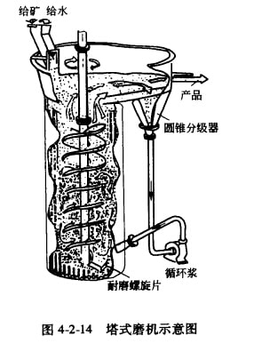(3)塔式磨礦機(jī):20世紀(jì)50年代由日本研制成功,現(xiàn)已被歐美及其他國家在細(xì)密領(lǐng)域相繼采用,至80年代中期,世界約有280多臺塔式磨機(jī)用于各種物料的細(xì)密生產(chǎn),其磨礦細(xì)度為1-100μm,單位電耗比臥式磨機(jī)降低50%—60%。塔式磨礦機(jī)的結(jié)構(gòu)見圖4-2-14。塔式磨機(jī)與臥式細(xì)磨機(jī)不同之處在于:介質(zhì)充填率可以超過50%,甚至達(dá)70%-80%,大幅度增加研磨面積。螺旋葉片攪動磨內(nèi)介質(zhì),形成充分的研磨作用。磨礦介質(zhì)尺寸小于25mm,介質(zhì)可以是鋼球或礫石。產(chǎn)品從磨機(jī)上部排出,排出前先經(jīng)圓錐分級機(jī)分級,溢流排出磨機(jī),沉砂再進(jìn)入磨機(jī)循環(huán)再磨。此種高效細(xì)磨機(jī)在世界各地已獲廣泛應(yīng)用,技術(shù)比較成熟。