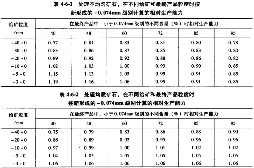 磨礦產(chǎn)品粒度對于生產(chǎn)能力的影響,決定于兩個相互矛盾的因素。一方面,磨租粒原礦至規(guī)定細(xì)度時,隨磨礦時間的增長,被磨物料 的平均粒度皆愈來愈小,磨礦機的生產(chǎn)能力因而愈到后期愈高。另一方面,由于磨礦的選擇作用,易磨部分已被磨細(xì).剩下的都是難磨 部分,因而磨礦機的生產(chǎn)能力愈到后期愈低。由于這兩種情況相反的因素影響,磨礦產(chǎn)物粒度與磨機處理能力的關(guān)系,可能是上升的、 下降的或先上升后下降,以及實際上沒有變化等情況,隨這兩個矛盾因素的對比所決定。大體上說,對于均質(zhì)礦石,磨礦機的相對生產(chǎn) 能力隨磨礦細(xì)度的增加而增加,表示這兩種情況的數(shù)據(jù)載于表4-6-1和表4-6-2。