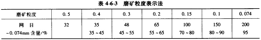 磨礦產(chǎn)品的粒度,通常是用磨至大于某篩級的篩上層百分?jǐn)?shù)或用-0.074mm的含量表示,表4-6-3是浮選廠對于磨礦粒度的表示法,可作為參考。