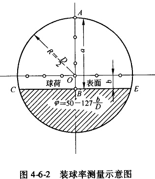 圖4-6-2為磨機橫截面,影線部分表示磨機靜止時球荷所占的面積,D為磨機內(nèi)直徑,測定球荷表面CBE到磨機筒體的最高頂點A的距離 為a,則球荷表面到磨機中心的距離b由圖看出為:
