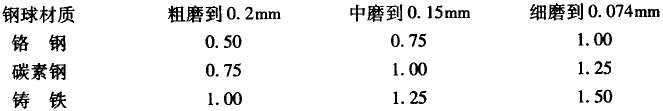 最初配好的鋼球為初裝球,一經(jīng)啟動磨礦后,鋼球就開始磨損,如果不補給球,球的大小和重量就不符合需要,瘩礦機的生產(chǎn)牢和磨 礦效率都會降低。球的磨損和礦石的硬度、礦塊或礦粒的級細(xì)、磨礦的細(xì)度、磨機的轉(zhuǎn)速率和裝球以及鋼球的材質(zhì)等因素有關(guān),鋼球的 磨損情況大致是(kg/t礦):