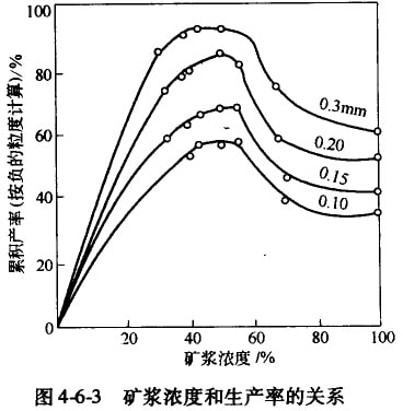 圖4-6-3說明礦漿濃度與磨礦效果的關(guān)系,由圖中看到,只有磨礦濃度適當(dāng)時,產(chǎn)出率才會員高,它隨被磨物料性質(zhì)及工藝條件而定。就中等轉(zhuǎn)速的磨機來說,租磨礦(產(chǎn)品細(xì)度在0.15-以上)或磨比重大的礦石時,磨礦濃度應(yīng)當(dāng)較大,約75%-82%(固)。細(xì)磨礦(產(chǎn)品細(xì)度在 0.01-0.075mm)或磨比重較小的礦石時,磨礦濃度應(yīng)低些,通常為65%-75%(固)。轉(zhuǎn)速較高時,磨礦濃度應(yīng)稍低一點。某廠的棒磨機的 磨礦濃度以78%-80%(固)為最好,這時產(chǎn)出的+0.25mm的較少,-0.074mm較多。另一個礦的球磨機,第一段磨的磨礦濃度以72%-75%( 固)較好,第二段以69%-72%(固)較好。這是礦石性質(zhì)不同的結(jié)果,影響的礦石性質(zhì)主要是礦石比重及含泥量因素。