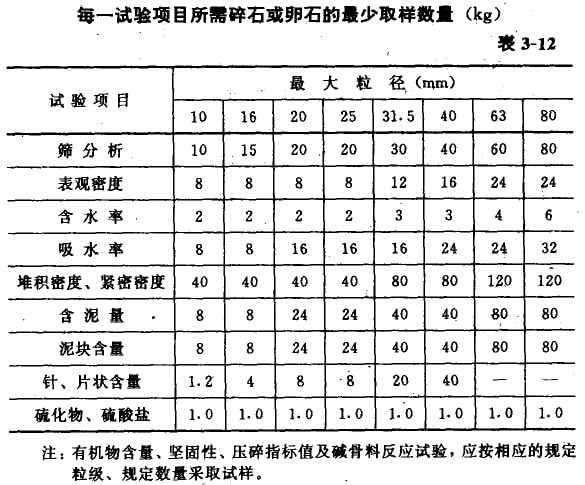 每一單項(xiàng)試驗(yàn)的試祥應(yīng)不少于表3-12所規(guī)定的最小取樣數(shù)量。須作兒項(xiàng)試驗(yàn)時(shí),如確能保證試樣經(jīng)一項(xiàng)試驗(yàn)后不致影響另一項(xiàng)的試驗(yàn)結(jié)果,可用同一批試樣進(jìn)行幾項(xiàng)不同的試驗(yàn)。