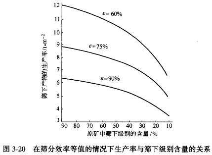被篩物料的粒度組成,對于篩分過程有決定性的影響,在任何情況下,細?偸潜却至H菀淄ㄟ^篩孔。因此,當物料中細級別含量增大時,篩子的生產率也隨之顯著增大。圖3-20所示曲線表示不同篩分效率時的生產率(按篩下產物計算)與原料中細粒級含量之間的關系。由圖可以看出,當原物料中篩下級別的含量由10%增加到90%時,篩子的生產率幾乎增大一倍。這是因為,當篩下級別含量大的物料給入篩面時,細粒很迅速地通過篩孔,而留在篩上的物料就很少了, 此時,即使在篩上物料中還有一些"難篩粒",相對地比較容易通過篩孔,因為其他礦粒對它們的影響小。反之,當原物料中篩下級別含量少時,因為整個篩面幾乎被篩上產物所占據(jù),妨礙了細粒通過篩孔,因此,在保證篩分效率相等的條件下,按給礦量計算的生產率也就降低了;所以當原物料中細級別含量少,而粗級別的粒度又比篩孔尺寸大得多的時候,為了提高篩子的生產能力和延長篩網(wǎng)的使用壽命,可以采用增加輔助篩網(wǎng)的方法,用篩孔尺寸較大的輔助篩網(wǎng),預先篩除篩上產物過粗的級別,然后用下層篩網(wǎng)對含有大量細級別的物料進行最終篩分,此時,雙層篩作單 層篩使用,只接兩個產品。