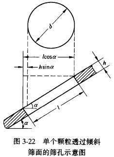 一般情況下,篩子是傾斜安裝的,以便于排出篩上物料。傾角大小要合適,傾角過小,物料在篩面上運動速度太慢,雖然篩分效率高,但篩子的生產率減;反之,傾角太大,物料排出太快,篩分效率降低。當篩面傾斜安裝時,可以讓顆粒順利通過的篩孔尺寸只相當于篩孔的水平投影,如圖3-22所示。能夠無阻礙地透過篩孔的顆粒直徑等于d = Icosa - hsina,式中I為篩孔尺寸,h為篩面厚度,a為篩子的傾角。由此可見,篩面的傾角愈大, 使顆粒通過時受到的阻礙愈大。因此,篩面的傾角要適當。表3-9所示為篩面的傾角與篩下物最大粒度及篩孔尺寸的關系。