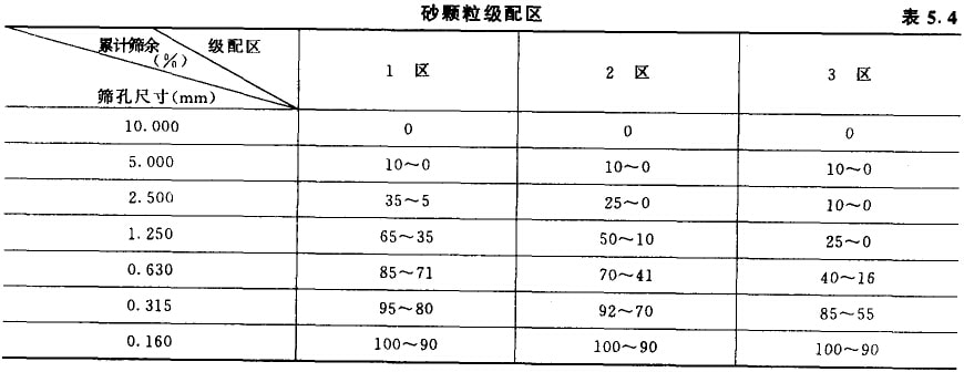 混凝土用砂的顆粒級配的累計篩余百分率處于表5.4中任何一個級配區(qū)范圍,則認為該砂的級配合格‘若有超越,只允許在2.500mm、1.250mm、0.315mm和0.160mm四個篩孔發(fā)生,且超越總雖的絕對值應小于或等于5%,而對5.000mm和0.630mm篩孔,則不允許有超越;否則,砂的級配視為不合格。