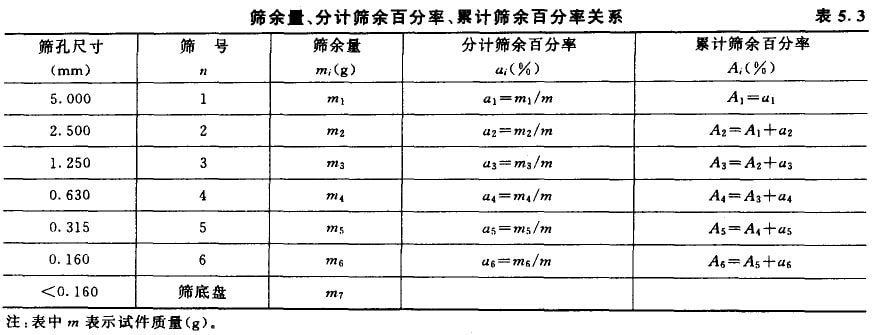 砂的粗細和顆粒級配的判斷有賴于篩分析試驗。篩分析試驗是用一套孔徑(凈徑)為5、2.5、1.25、0.63、0.315及0.16mm的6個標準篩,格500g的干砂試樣由粗到紉依次過篩,然后稱得遺留在各篩上砂子的質量,計算出各篩上的分計篩余百分率(各篩上篩余量占砂樣總量的百分數(shù))及累計篩余百分率(各篩和比該篩粗的所有分計篩余百分串之和)。篩余量、分析篩余百分率、累計篩余百分率的關系見表5.3。