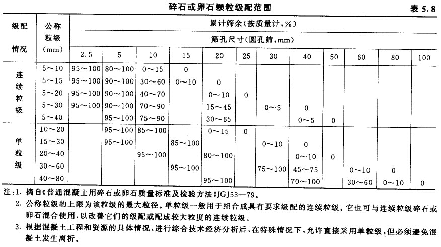 粗骨料的級配也是通過篩分實驗來確定的,其標準篩孔徑為2.5mm、5mm、10mm、16mm、20mm、25mm、31.5mm、40mm、50mm、63mm、80mm及100mm十二個篩。分計篩余百分率、累計篩余百分率的計算與砂相同。依據(jù)標準JGJ53-92,普通混凝土用碎石及卵石的顆粒級配范圍應符合表5.8的規(guī)定。