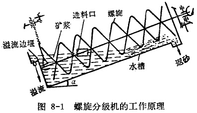 螺旋分級機(圖8-1)通常是由以下幾部分組戊:半圓形的水槽;作為排礦機構的螺旋裝置;支承螺旋軸的上、下軸承部;螺旋軸的傳動裝置和螺旋軸的升降機構。