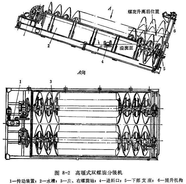 圖8-2為高堰式雙螺旋分級機的結構圖。半圓形水槽2通常用鋼板和型鋼焊成,其側壁沒有進料口。返砂口介槽體上端的下部。為了在必要時能排出砂漿,水槽下部沒有放水閥,正常工作時關閉。