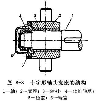 十字形軸頭支座的結構如圖8-3所示。支座兩側的軸頭支承在傳動架上。這種裝置可以滿足螺旋軸在作旋轉運動的同時,又可作升降運動。