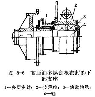 下部支座長期沉沒在礦漿中,因而軸承的密封裝置是保證設備正常運轉的關鍵問題。目前,常用的下部軸承的密封裝置有三種,即機械密封滾動軸承支座(圖8-4)、壓力水封樹脂瓦滑動軸承支座(圖8-5)及壓力水封橡膠軸襯(一船用皮帶機廢肢帶組疊而成)。這些結構型式的密封性均不夠理想,最近,在機械密封滾動軸承支座的基礎上,用手動干油泵注入高壓油,壽命可達1年左右,其結構如圖8-6所示。
