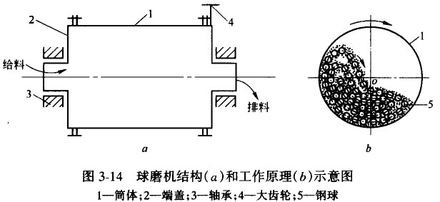 圓筒形球磨機在細磨中應用員為廣泛,圖3-14所示為球磨機的結(jié)構(gòu)和工作原理。主要由圓柱筒體、端蓋、中空軸頸、軸承和傳動大齒圈等部件組成。筒體內(nèi)裝有直徑為25-150mm鋼球,其裝入且是整個筒體有效容積的25%-50%。筒體內(nèi)壁設有襯板,除防止筒體磨損外,兼有提升鋼球的作用,筒體兩端的中空軸頸有兩個作用:一是起軸頸的支撐作用,使球磨機全部重量經(jīng)中空袖頸傳給軸承和機座;二是起給料和排料的漏斗作用。電動機通過聯(lián)軸器和小齒輪帶動大齒圈和筒體以一定轉(zhuǎn)速轉(zhuǎn)動。