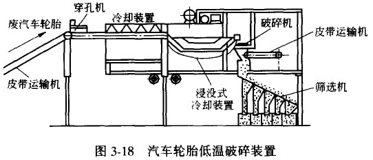 圖3-18所示為廢汽車輪胎的低溫破碎工藝。經(jīng)皮帶運(yùn)輸機(jī)送來(lái)的廢輪胎采用穿孔機(jī)穿孔后,經(jīng)噴灑式冷卻裝置預(yù)冷,再送浸沒(méi)式冷卻裝置冷卻。通過(guò)輥式破碎機(jī)破碎分離成“橡膠和夾絲布”與“車輪圓緣”兩部分,然后送至裝有磁選機(jī)的皮帶運(yùn)輸機(jī)進(jìn)行磁選;前者經(jīng)錘破機(jī)和盤磨機(jī)二次破碎后送篩選機(jī)分離成不同粒度至再生利用工序。