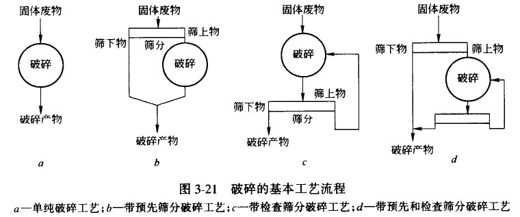 到目前為止,對(duì)固體廢物的破碎多采用機(jī)械方法,破碎設(shè)備通常也是由兩種或兩種以上的破碎方法聯(lián)合作用對(duì)廢物進(jìn)行破碎的。根據(jù)固體廢物的性質(zhì)、顆粒大小和選用的破碎機(jī)類型,每段破碎流程都可以有不同的組合方式,其基本的工藝流程如圖3-21所示。