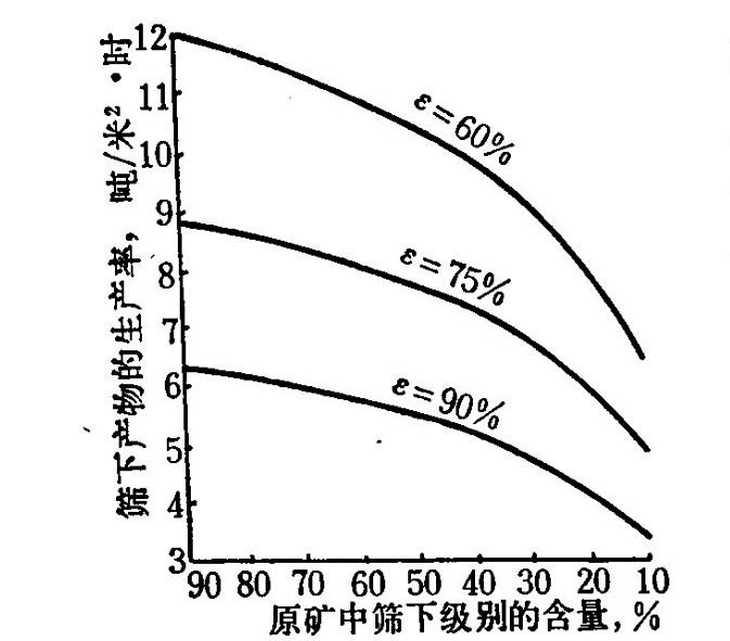 物料的粒度組成對篩分過程有決定性的影響。在任何情況下,細?偸潜却至H菀淄ㄟ^篩孔。因之,當物料內(nèi)細級別含量增大時,篩子的生產(chǎn)率(無論按給礦量計算還是按篩下產(chǎn)物計算)也隨之顯著增大。下圖的曲線表示不同篩分效率時生產(chǎn)率(按篩下產(chǎn)物量計算)與原物料內(nèi)細粒級別含量之間的關(guān)系。由圖可以看出,當原物料內(nèi)篩下級別的含量由10%增加到90%時,篩子的生產(chǎn)率幾乎增大一倍。這是因為當篩下級別含量大的物料給到篩上時,細粒就很容易且迅速通過篩孔,而留在篩上的物料就很少了,這時即使在篩上物料內(nèi)還有一些"難篩顆粒",相對地比較容易通過篩孔,因為其他的礦粒對它們的影響也小。反之,當原物料內(nèi)篩下級別含量少時,因為整個篩面幾乎被篩上產(chǎn)物所占據(jù),妨礙了細粒子通過篩孔,因此在保證篩分效率相等的條件下,按給礦量計算的生產(chǎn)率也就降低了。所以當原物料中細級別少,而粗級別的粒度又比篩孔尺寸大得很多的時候,有的生產(chǎn)廠為了提高篩子的生產(chǎn)能力和延長篩網(wǎng)的使用壽命采用雙層篩作單層篩使用。上層篩孔較大的輔助篩網(wǎng)預先排出過粗的級別,然后下層篩對含有大量細級別的較細物料進行最終篩分。