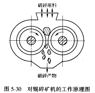 對輥破碎機(jī)的工作原理如圖5-30所示。物料從上面加入破碎機(jī),兩個圓輥相向旋轉(zhuǎn),由于物料與輥面的摩擦力將物料卷入破碎腔小,被輥子所壓碎。已破碎的礦石,在重力作用下,從兩個輥子間的間隙處排出。