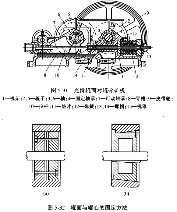目前在選礦廠中,應(yīng)用的輥式碎礦機(jī)為單可動軸式光滑輥面的對輥碎礦機(jī),在選煤廠中則常用非光滑輥面的對輥碎礦機(jī)。