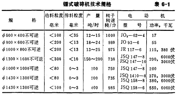 錘式破碎機(jī)技術(shù)規(guī)格如表6-1。