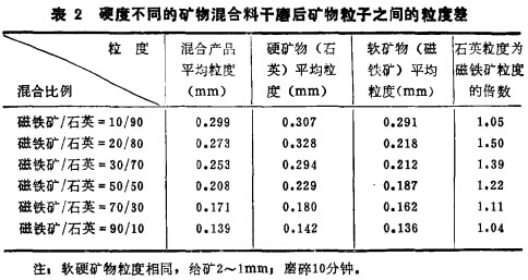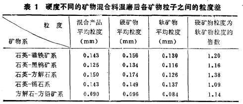 大量的實(shí)驗(yàn)研究結(jié)果證實(shí),不同硬度礦物的混合礦料磨碎 時(shí),產(chǎn)物中各種礦物粒子之間存在著明顯的粒度差。用多種純礦物混合料在不連續(xù)磨機(jī)中濕磨后所得到的產(chǎn)物中,硬度不同的礦 物粒于的加權(quán)算術(shù)平均粒度值及軟硬礦物的拉度關(guān)如表l所列。
