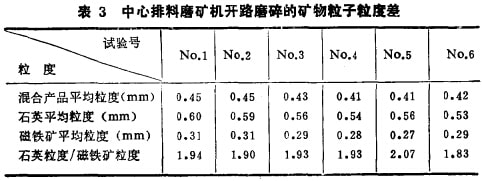 將表3、4與表l、2進(jìn)行對比不難看出,連續(xù)磨礦條件下的礦物粒度差值更大,這是由于無論是開路還是閉路,都是物料在磨機(jī)內(nèi)停留的時(shí)間較短所致。反之在不連續(xù)磨機(jī)中,無論物料粒度是否已達(dá)到,均要磨到一定時(shí)間。顯然磨碎的時(shí)間愈長,物料的檢度愈細(xì),而愈細(xì)的物料由于強(qiáng)度差愈小,放粒度差值也愈小。在實(shí)際生產(chǎn)中均是連續(xù)磨礦,所以不同硬度礦物的粒度差比較顯著。