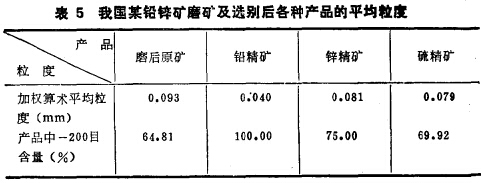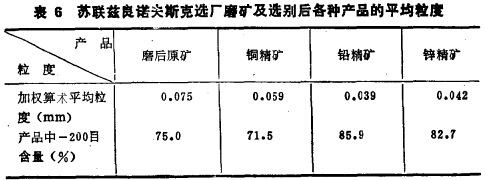 在生產(chǎn)實(shí)踐中,產(chǎn)品存在不同礦物粒子粒度差的例子也很多。廣西某沿鋅礦選廠磨礦及選礦產(chǎn)品的篩析計(jì)算結(jié)果列入表 5。從表l可以看出,硬度愈低的礦物粒度愈細(xì),硬度愈高的礦物 粒度愈粗。蘇聯(lián)茲良諾夫斯克選礦廠處理多金屬硫化礦,磨后原礦及各種精礦也存在顯著的粒度差(表6)。