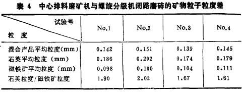 表3為中心排料磨礦機(jī)開路磨礦結(jié)果,表4為中心排料磨礦機(jī)與螺旋分級機(jī)閉路磨礦結(jié)果。由表3、4可見,在連續(xù)磨礦條件下,硬度不同的純礦物混合物磨碎后仍然存在粒度差。