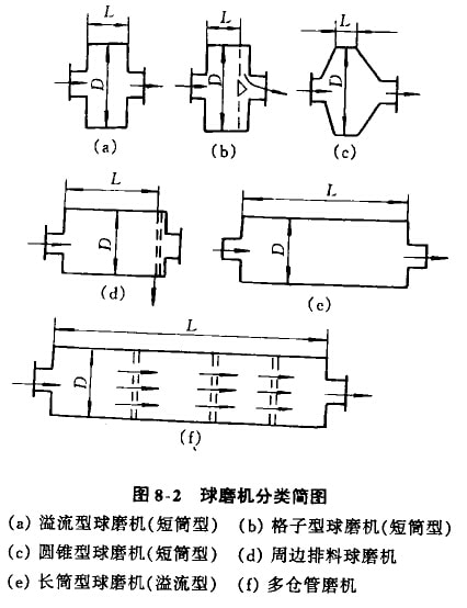 ②長(zhǎng)筒磨機(jī):簡(jiǎn)體長(zhǎng)度L=(1.5-3)D,如圖8-2(e)所示。
