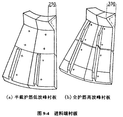 濕式自磨機筒體內(nèi)表面襯有七種不同形狀的襯板。進料端襯板如圖9-4所示,它直接受到剛?cè)肽C的大塊物料的沖擊,同時又受到回轉(zhuǎn)運動物料的磨損,因此,它的損耗是很快的。為了避免物料沖擊板面,則在襯板靠近中心的一端,設有250mm高的波峰。為了避免物料環(huán)向運動的磨損,則在外圈襯板上設有80x80mm截面的護筋。實踐證明,波峰高增加到330mm,并在內(nèi)圈上也增加了護筋,其壽命可延長2-2.5倍。